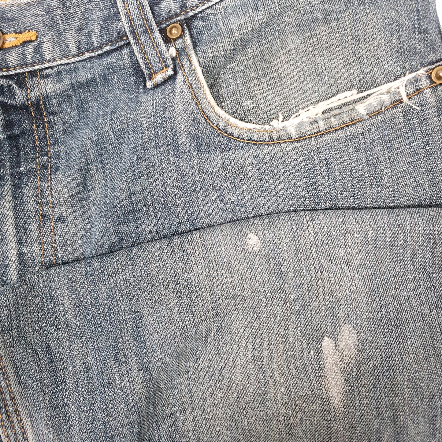 Notes: Light marking throughout, white marks to left thigh, white mark to back right pocket, fraying around pockets and some marking around lower legs.
