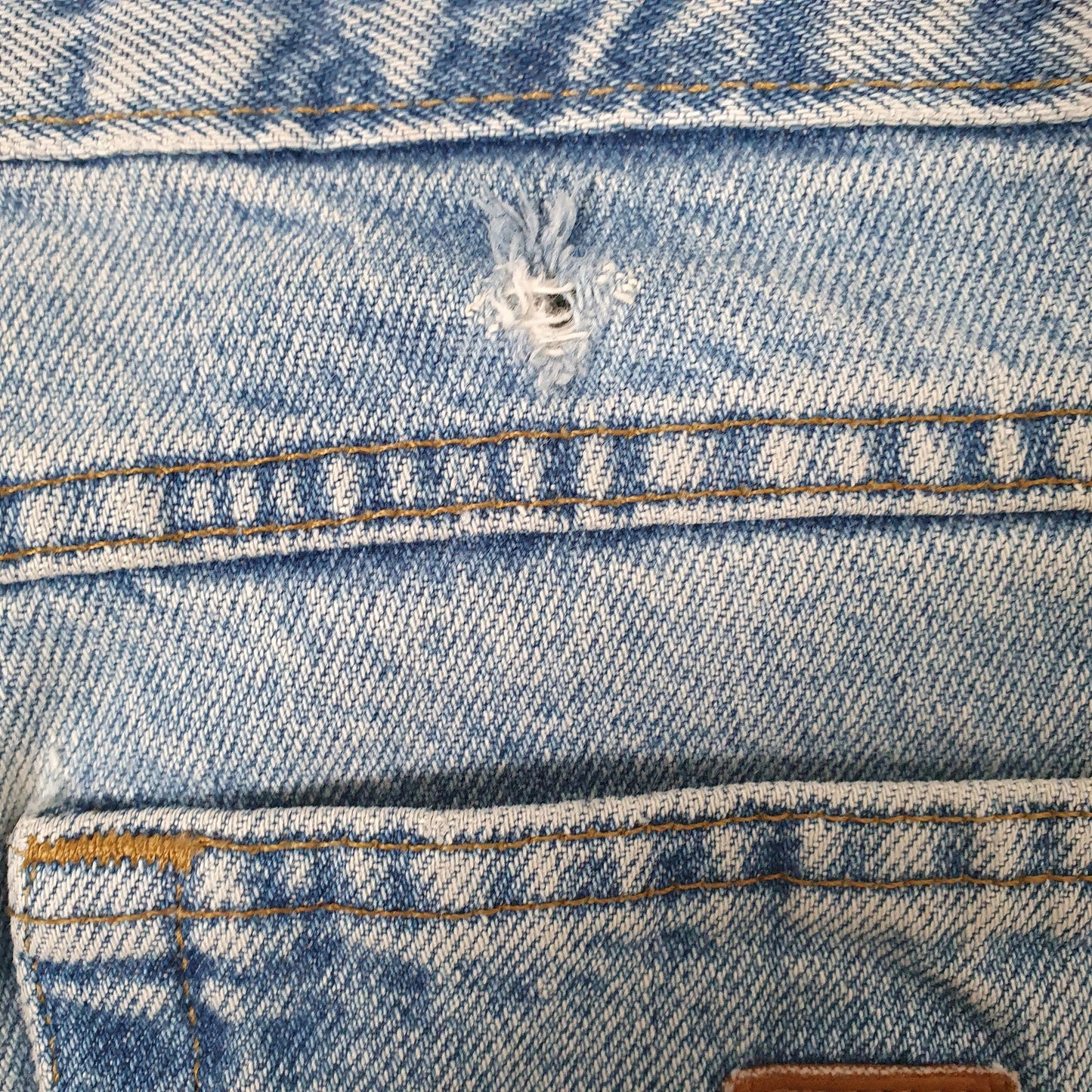 Noticeable brown marking to front and back of legs, fading throughout and small hole above back right pocket.
