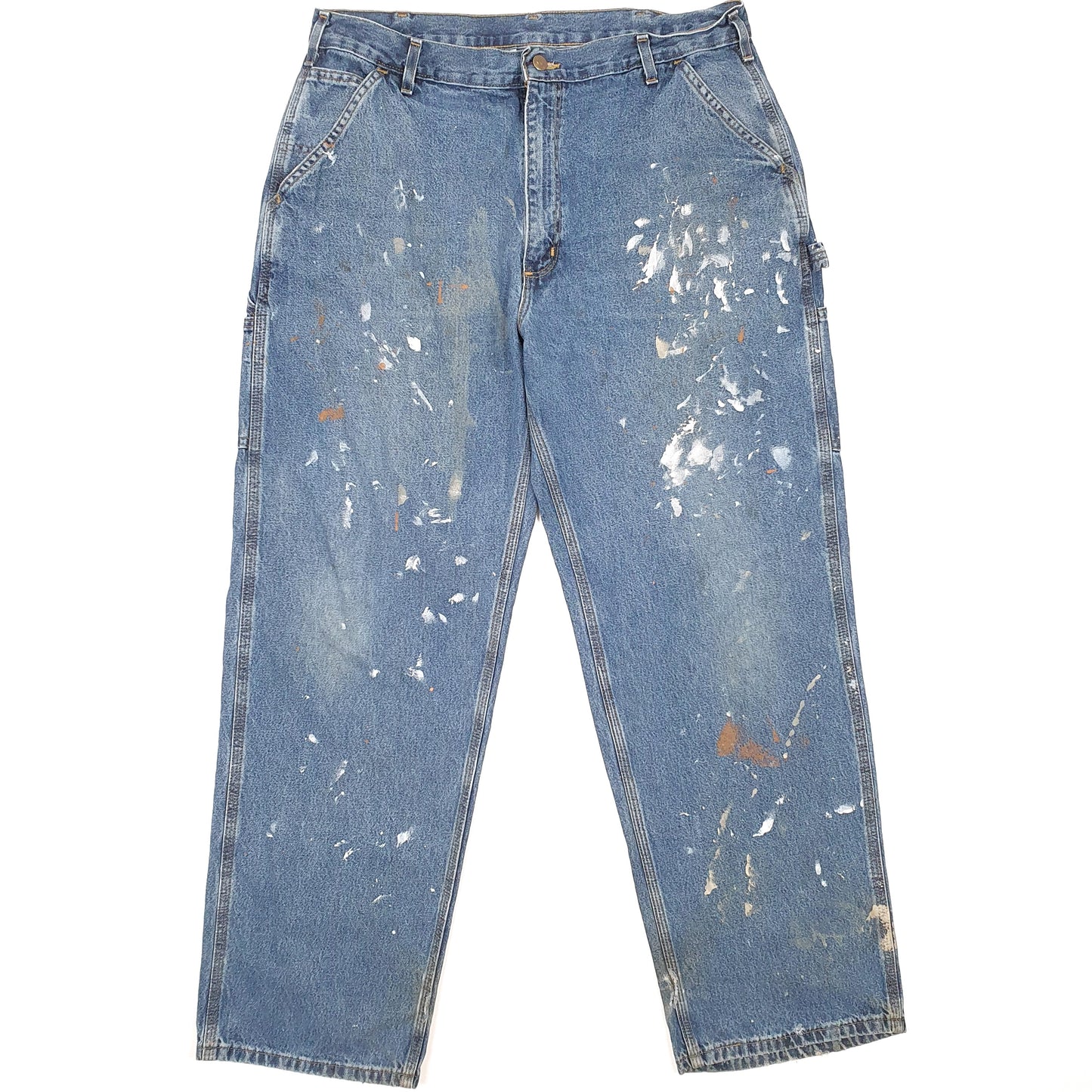 Heavy paint staining to front of jeans, some paint staining to back of jeans and some marking to lower legs.
