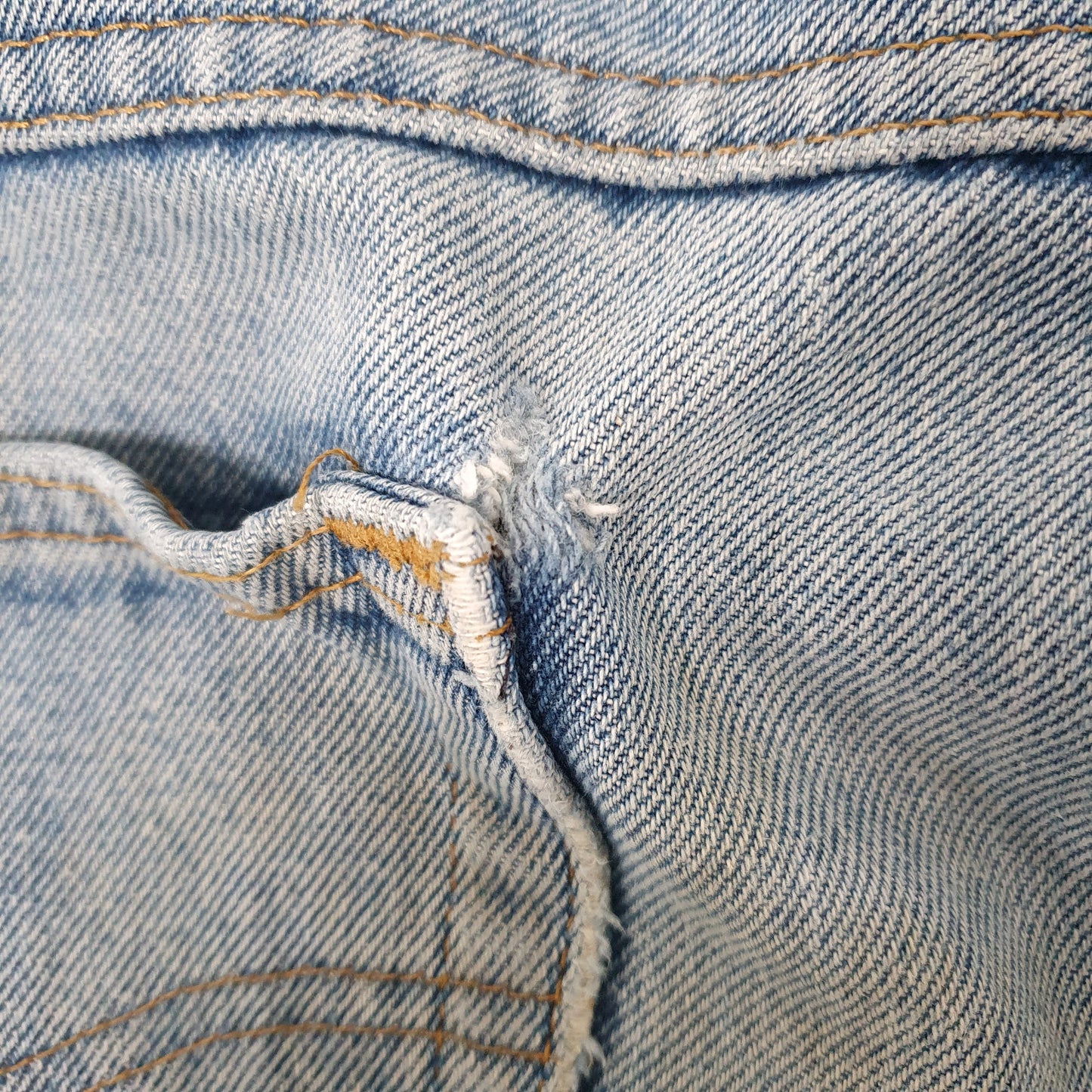 Various wear holes to front of jeans, scuffing, fading, light marking and slight holes developing where back pockets attach.