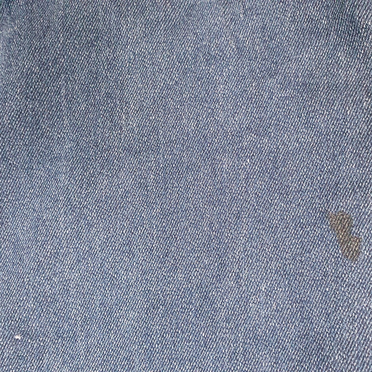 Light fading throughout and dark mark to lower inside of right leg.