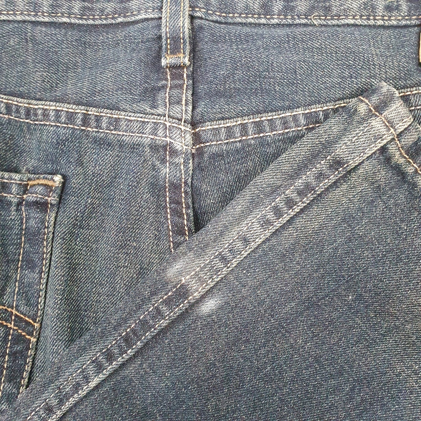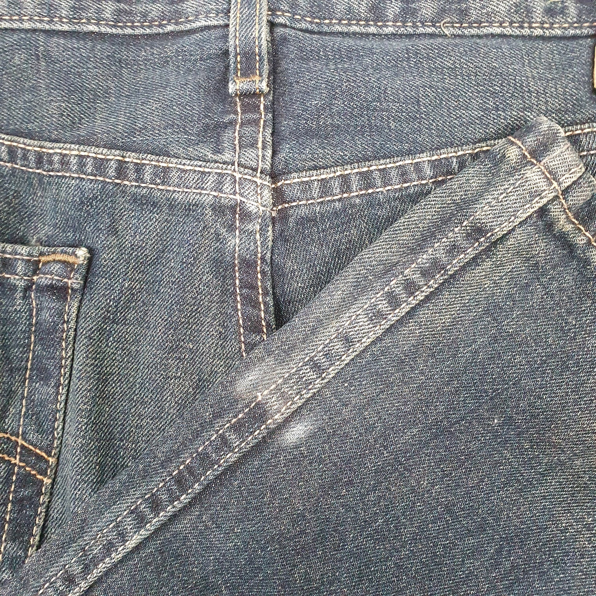 White mark at bottom of left leg and fading area between back pockets.