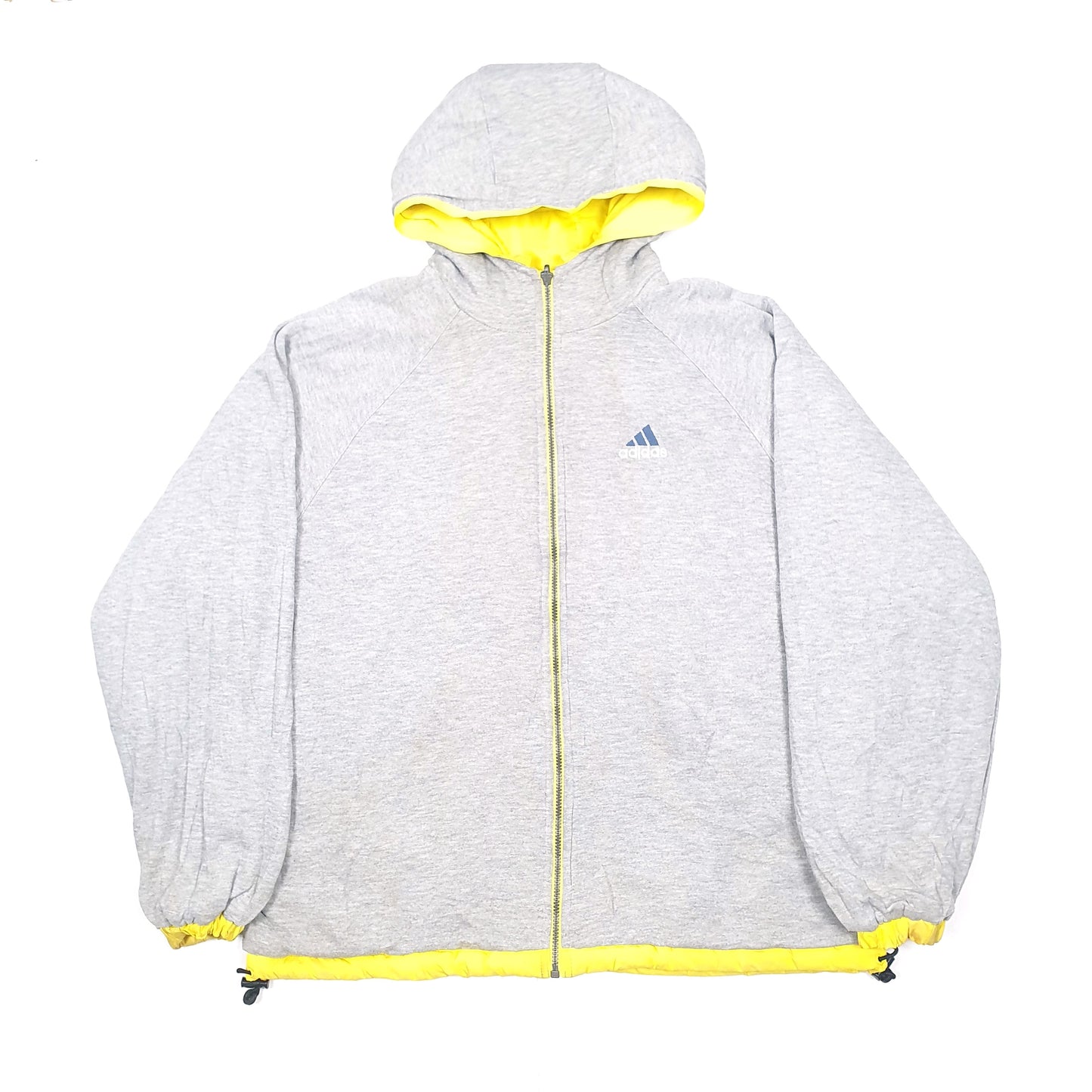 Several marks on the yellow sleeves, and some marks across the grey fabric. Could do with a good clean
