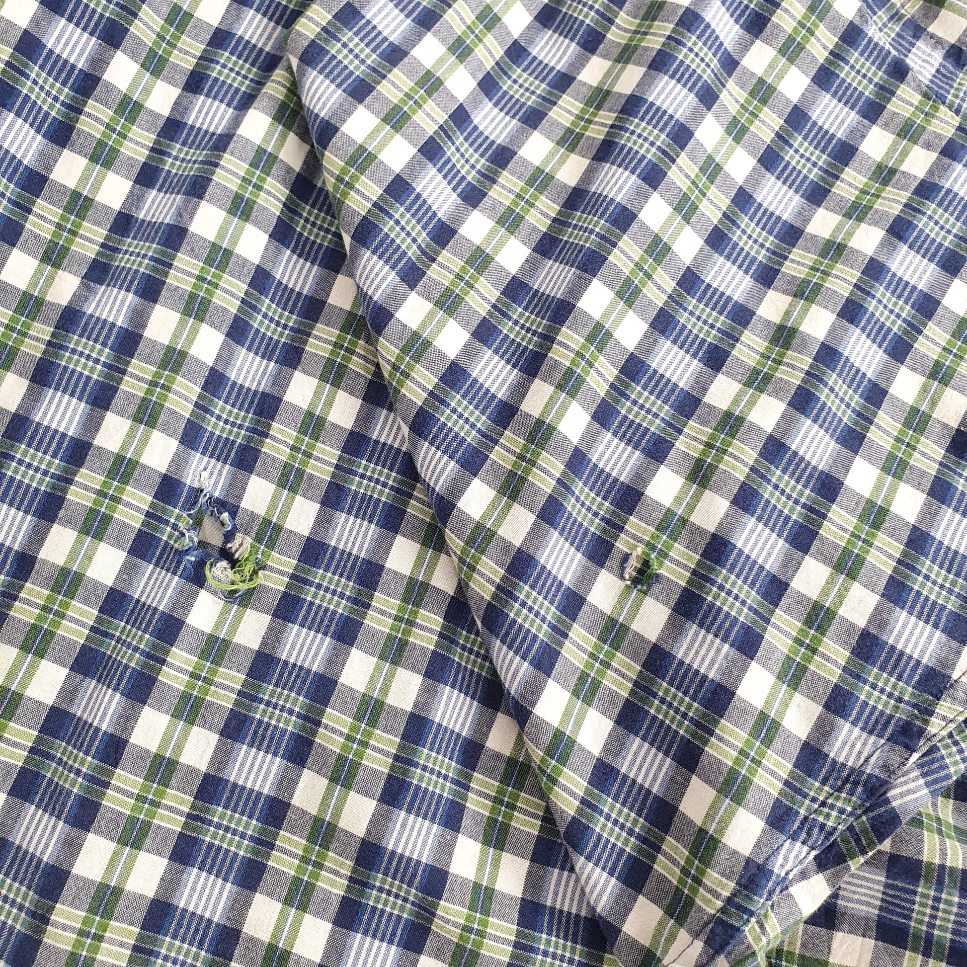Small hole on right sleeve and larger hole on lower back