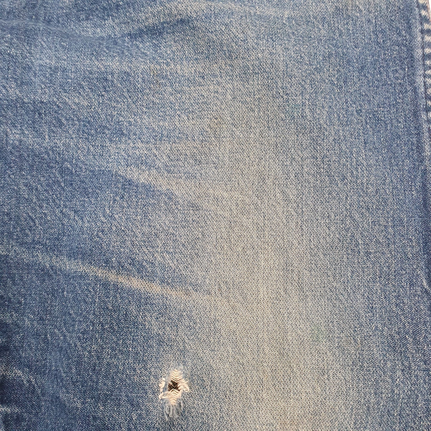 Fading throughout, slight yellowing within fading, light marking throughout and small hole to left thigh.